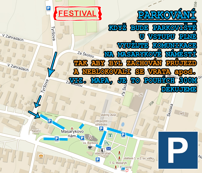 Parkoviště před vstupní bránou je bohužel omezené. V případě, že bude již plné, vás prosíme využijte komunikace na Masarykově náměstí, viz. mapa. Je to pouhých 300m od vstupní brány. Samozřejmě, tak aby byl zachován průjezd a neblokovaly se vjezdy k RD apod. V nočních hodinách prosíme o ohleduplnost k místním, v rámci zachování dobrého jména festivalu. Děkujeme.